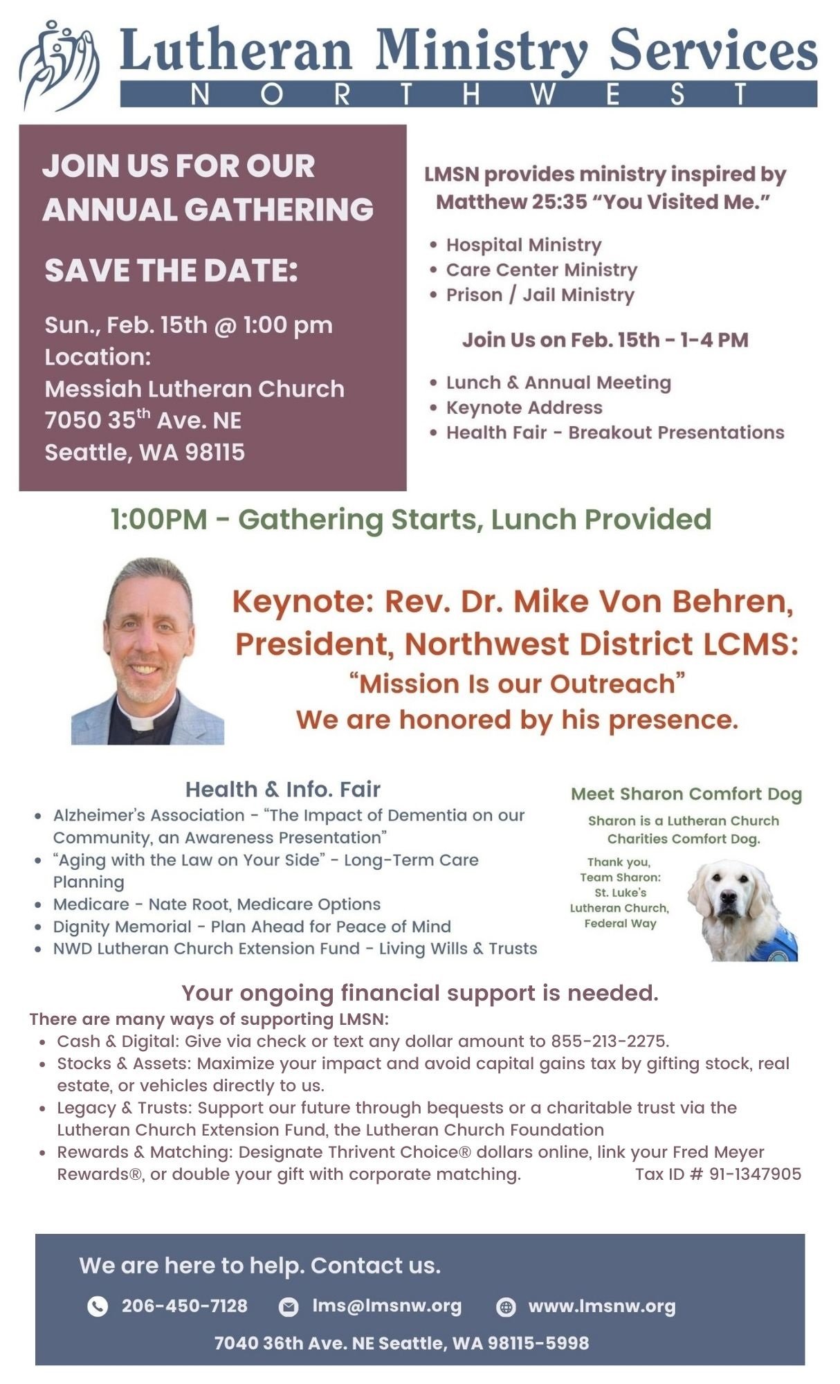 Lutheran Ministry Services Northwest. We provide chaplaincy ministry in Seattle area hospitals, nursing homes, jails/prisons. We are a Recognized Service Organization of The Lutheran Church Missouri Synod and a Social Ministry Organization of the ELCA.