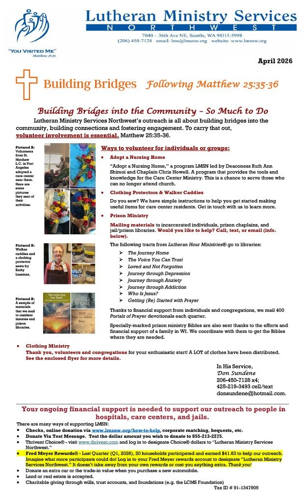 Lutheran Ministry Services Northwest. We provide chaplaincy ministry in Seattle area hospitals, nursing homes, jails/prisons. We are a Recognized Service Organization of The Lutheran Church Missouri Synod and a Social Ministry Organization of the ELCA.